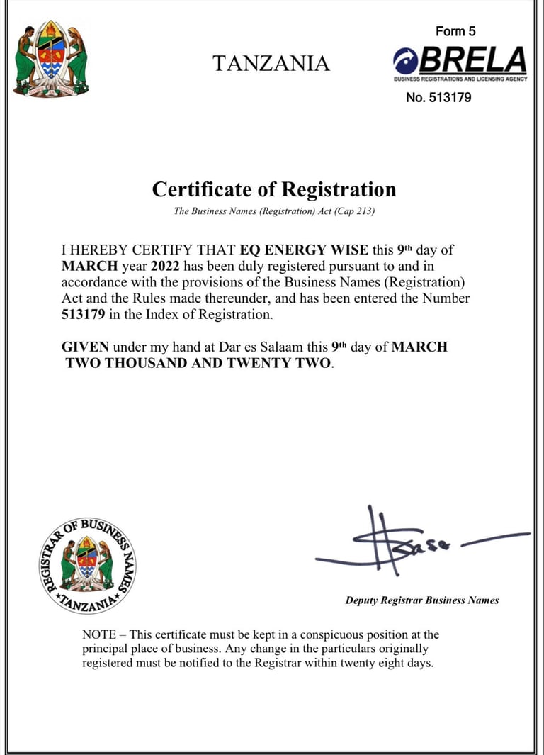 We are registered with The Business Registrations and Licensing Agency(BRELA), an Executive Agency under the Ministry of Industry and Trade responsible for business administration and regulation in Tanzania.